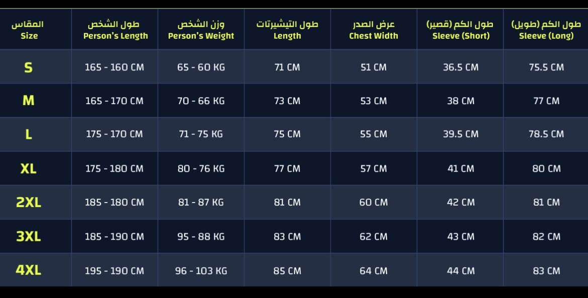 يرجى الملاحظه ان يوجد اختلاف بسيط بالمقاسات بفرق 3-6 سم لنسخة اللاعبين